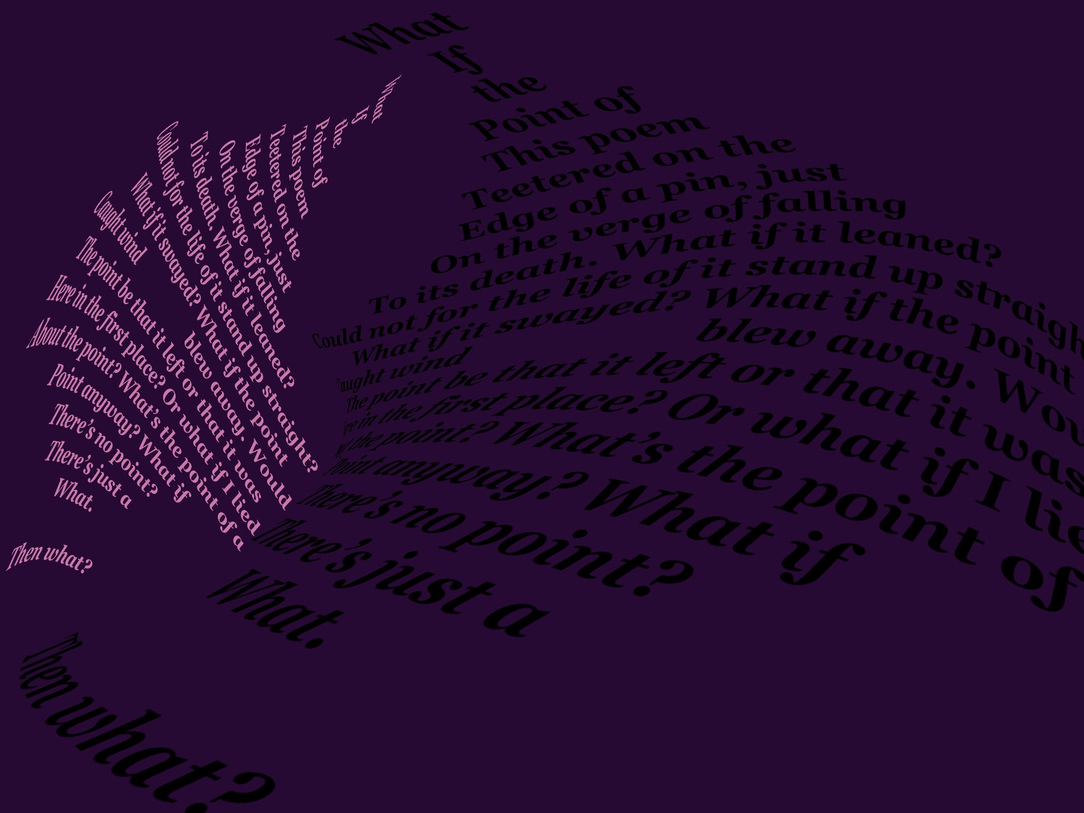 I wrote this poem as a catch-all response for, can you explain this poem to me? I could! But that would take away 50% of the fun from me, and 100% from you. I write the poem for one reason, but it has nothing to do with how it makes you feel or what it makes you think. Maybe the poem is about frogs to me, but it’s about elephants to you. Rather than nitpick about who picked the right animal, we can rejoice that we both picked animals at all. In fact, the author wrote that poem about an aunt who never let him eat her cherry pie because she would wait for her husband to leave home and share the pie with the mailman. What does it say about us that we read her as an animal? What else can we learn from the words if she actually was supposed to be an animal? Sometimes there’s nothing to get at all. We just read. We think one thought or many thoughts or read again or don’t. If you’re lucky though, something sticks.